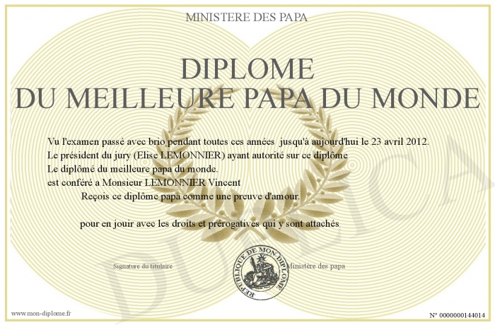 Envoyez par email votre Diplôme du meilleure papa du monde personalisé