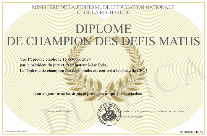 Envoyez par email votre Diplôme de champion des défis maths personalisé