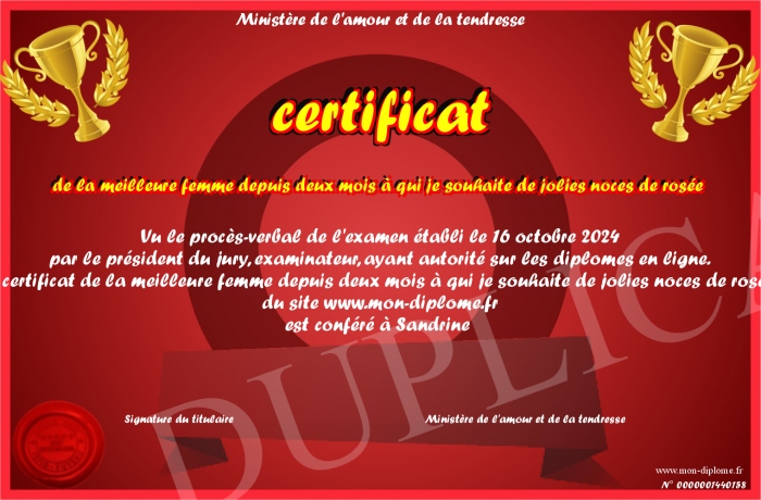 Envoyez par email votre certificat de la meilleure femme depuis deux mois à qui je souhaite de jolies noces de rosée personalisé