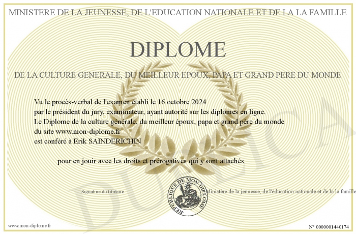 Envoyez par email votre Diplôme de la culture générale, du meilleur époux, papa et grand père du monde personalisé