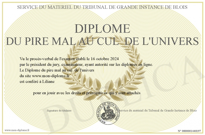 Envoyez par email votre Diplôme du pire mal au cul de l'univers personalisé