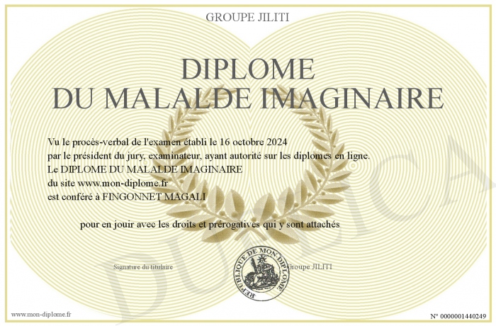 Envoyez par email votre DIPLOME DU MALALDE IMAGINAIRE personalisé