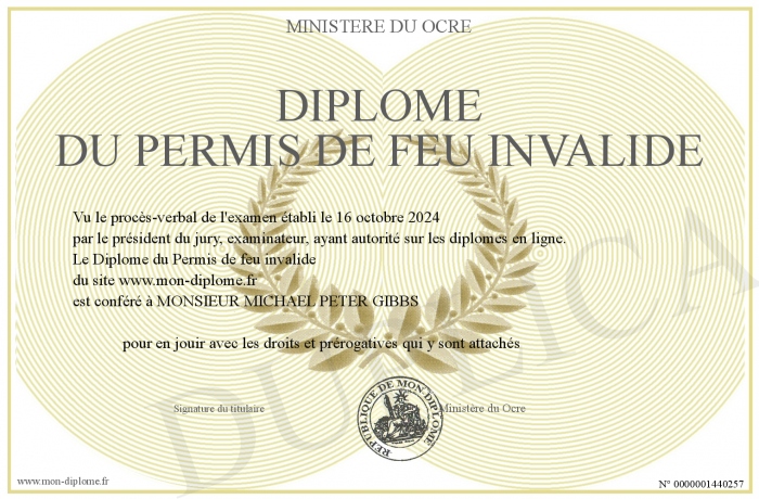 Envoyez par email votre Diplôme du Permis de feu invalide personalisé