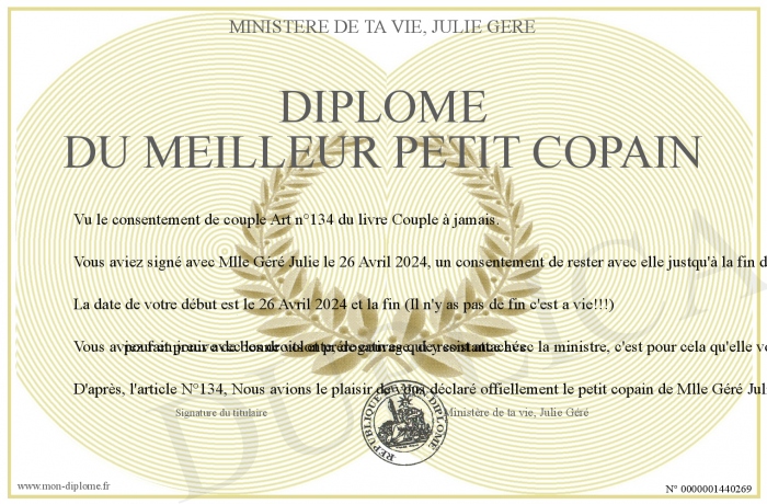 Envoyez par email votre Diplôme du meilleur Petit Copain personalisé