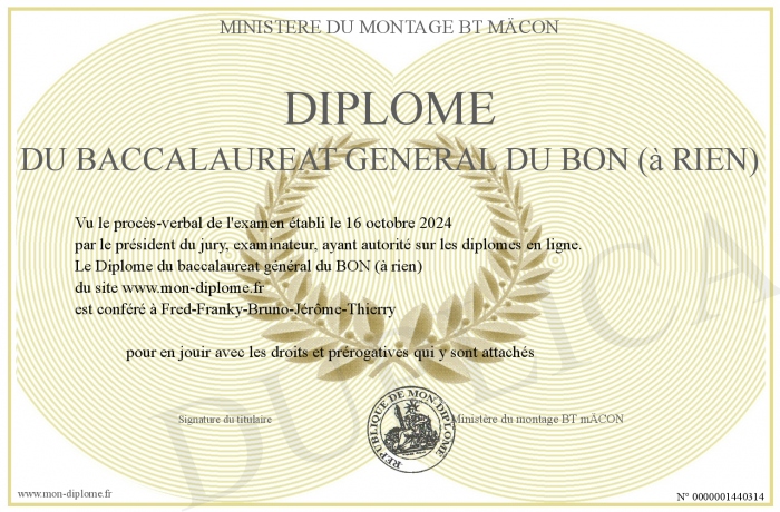 Envoyez par email votre Diplôme du baccalaureat général du BON (à rien) personalisé