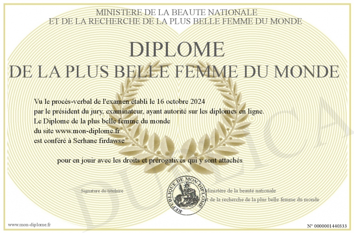 Envoyez par email votre Diplôme de la plus belle femme du monde personalisé