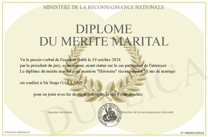 Envoyez par email votre Diplôme du mérite marital personalisé