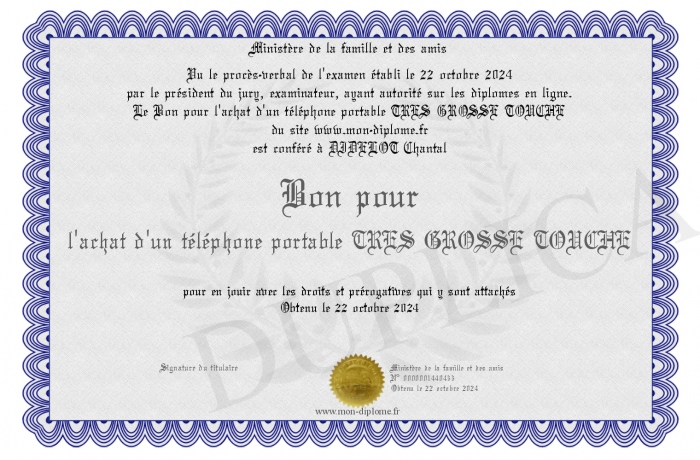 Envoyez par email votre Bon pour l'achat d'un téléphone portable TRES GROSSE TOUCHE personalisé
