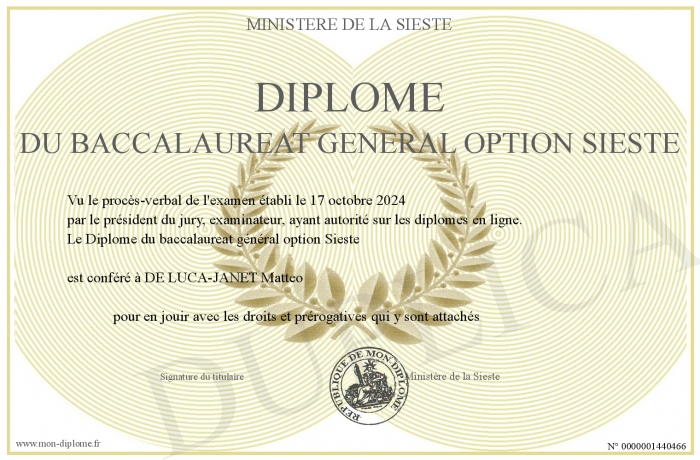 Envoyez par email votre Diplôme du baccalaureat général option Sieste personalisé