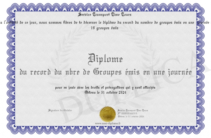Envoyez par email votre Diplome du record du nbre de Groupes émis en une journée personalisé