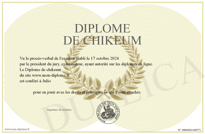 Envoyez par email votre Diplôme de chikeum personalisé