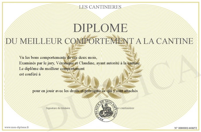 Envoyez par email votre Diplôme du meilleur comportement A la cantine personalisé