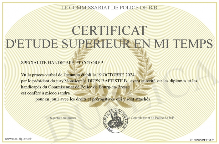 Envoyez par email votre certificat d'étude supérieur en mi temps personalisé