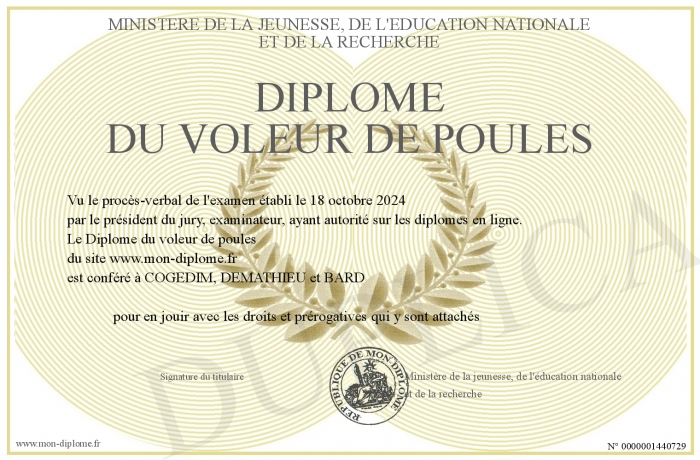 Envoyez par email votre Diplôme du voleur de poules personalisé