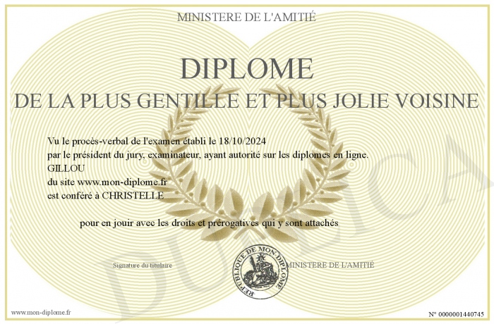 Envoyez par email votre DIPLOME DE LA PLUS GENTILLE ET PLUS JOLIE VOISINE personalisé