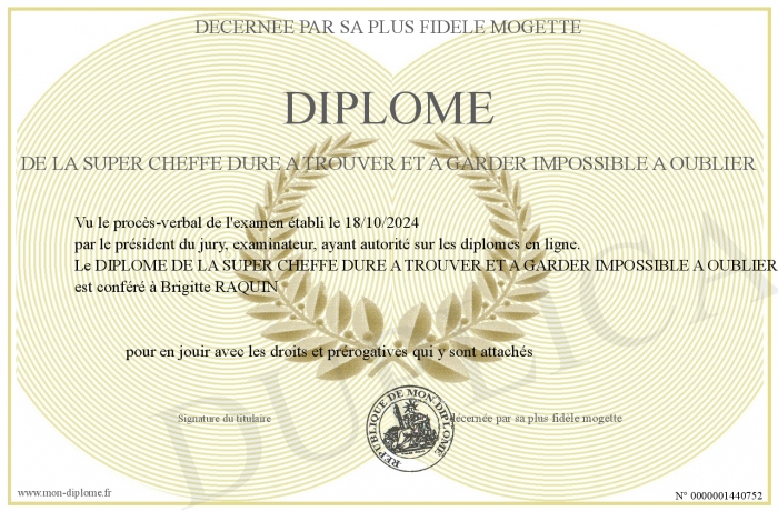 Envoyez par email votre DIPLOME DE LA SUPER CHEFFE DURE A TROUVER ET A GARDER IMPOSSIBLE A OUBLIER personalisé