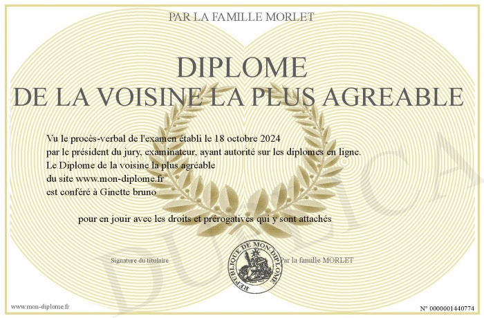 Envoyez par email votre Diplôme de la voisine la plus agréable personalisé