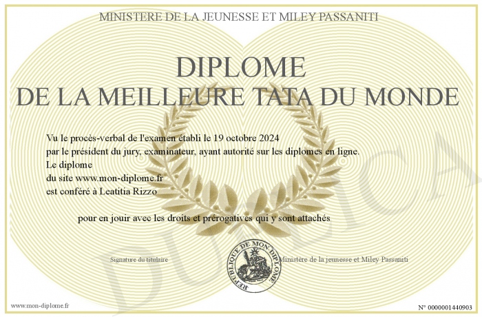 Envoyez par email votre Diplôme de la meilleure tata du monde personalisé