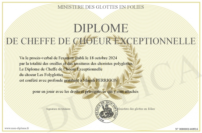 Envoyez par email votre Diplôme de Cheffe de Choeur Exceptionnelle personalisé