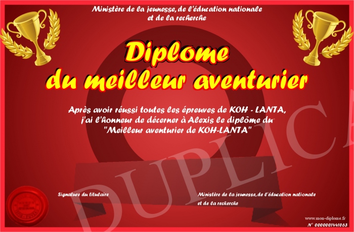 Envoyez par email votre Diplôme du meilleur aventurier personalisé