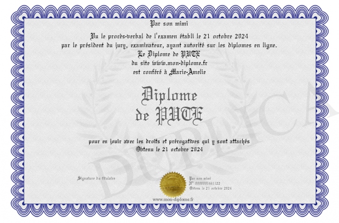 Envoyez par email votre Diplome de PUTE personalisé