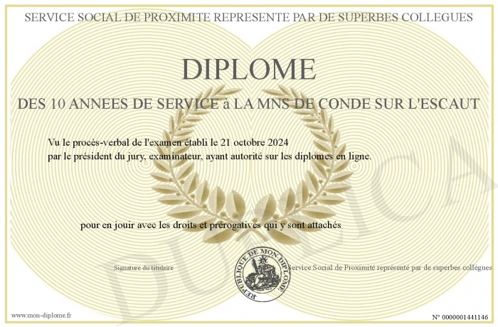 Envoyez par email votre Diplôme des 10 années de service à la MNS de Condé sur l'Escaut personalisé