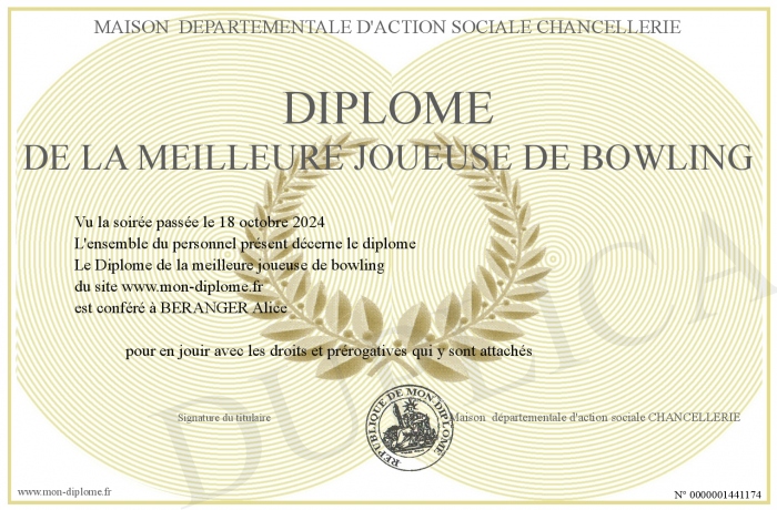 Envoyez par email votre Diplôme de la meilleure joueuse de bowling personalisé