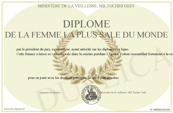 Envoyez par email votre Diplôme de la femme la plus sale du monde personalisé