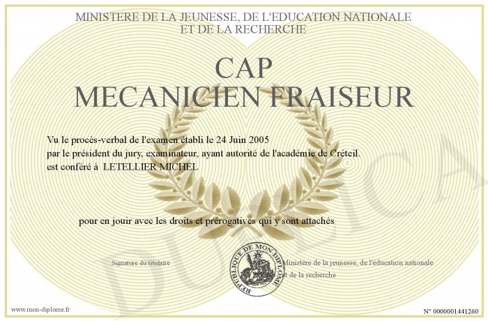 Envoyez par email votre CAP MECANICIEN FRAISEUR personalisé