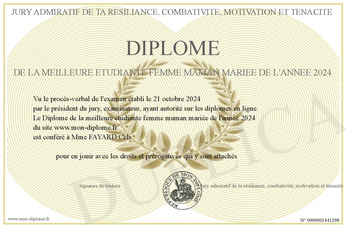 Envoyez par email votre Diplome de la meilleure étudiante femme maman mariée de l'année 2024 personalisé