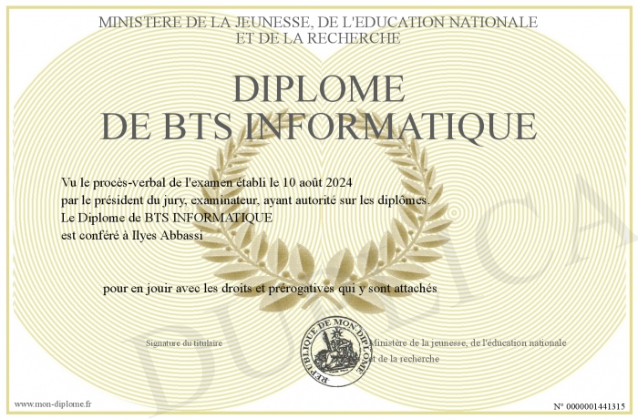 Envoyez par email votre Diplôme de BTS INFORMATIQUE personalisé