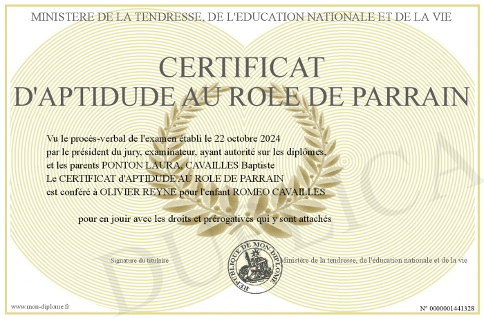 Envoyez par email votre CERTIFICAT d'APTIDUDE AU ROLE DE PARRAIN personalisé
