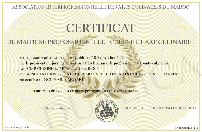 Envoyez par email votre CERTIFICAT DE MAITRISE PROFOSSIONNELLE CUISINE ET ART CULINAIRE personalisé