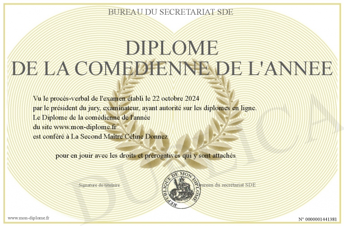 Envoyez par email votre Diplôme de la comédienne de l'année personalisé