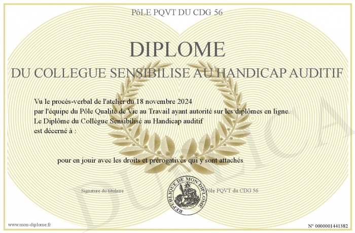 Envoyez par email votre Diplôme du collègue sensibilisé au handicap auditif personalisé