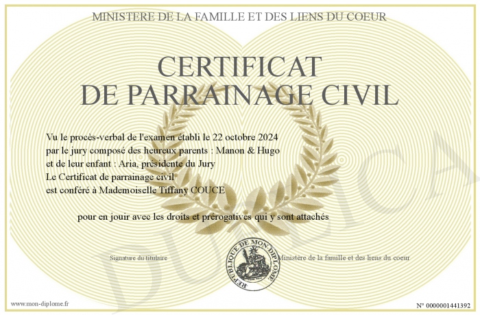Envoyez par email votre Certificat de parrainage civil personalisé