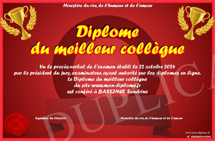 Envoyez par email votre Diplome du meilleur collègue personalisé