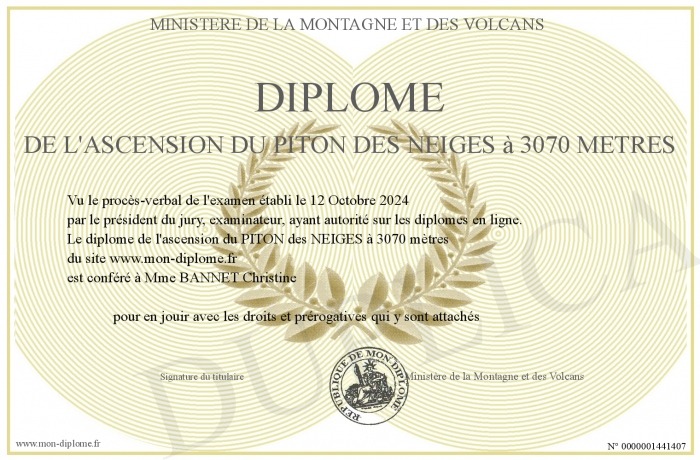 Envoyez par email votre diplôme de l'ascension du PITON des NEIGES à 3070 mètres personalisé