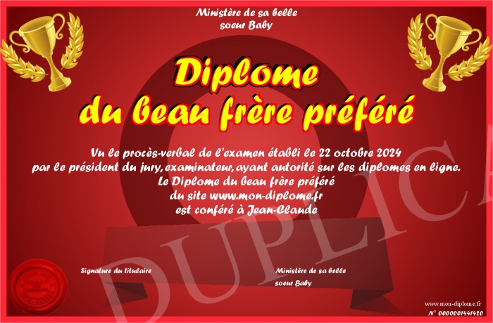 Envoyez par email votre Diplôme du beau frère préféré personalisé