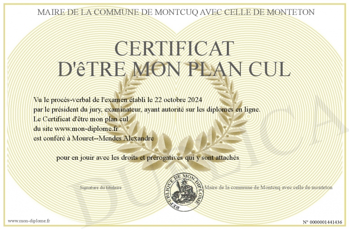 Envoyez par email votre Certificat d'être mon plan cul personalisé