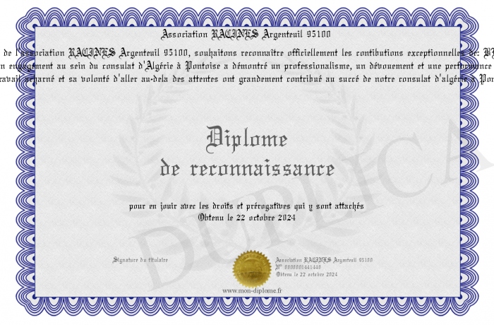 Envoyez par email votre Diplôme de reconnaissance personalisé