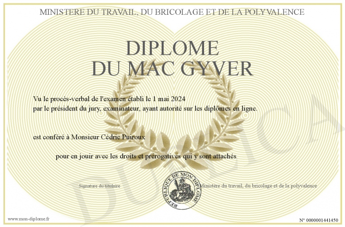 Envoyez par email votre Diplôme du Mac Gyver personalisé