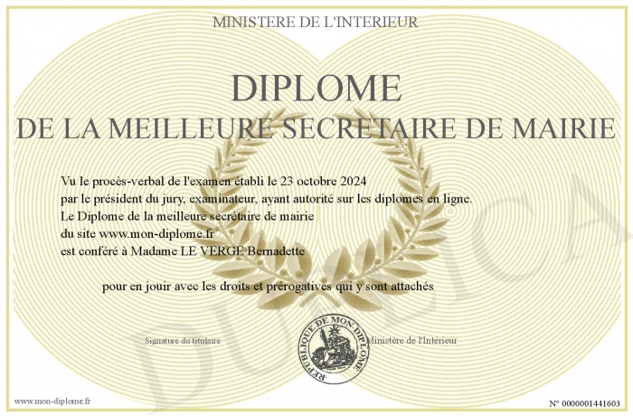 Envoyez par email votre Diplôme de la meilleure secrétaire de mairie personalisé