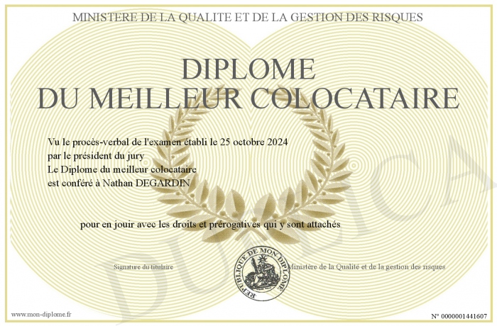 Envoyez par email votre Diplôme du meilleur colocataire personalisé