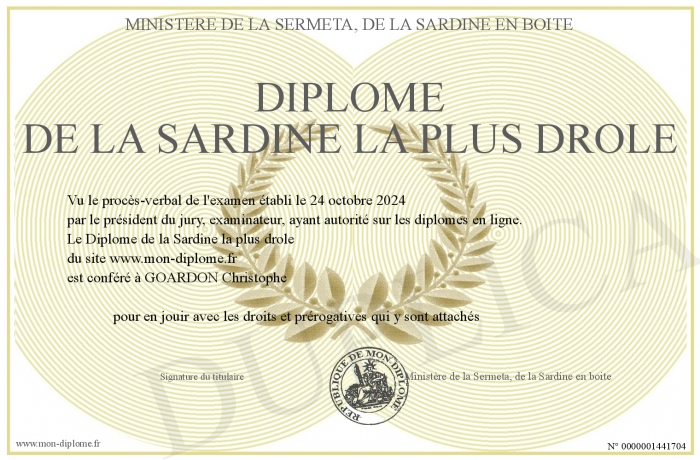 Envoyez par email votre Diplôme de la Sardine la plus drôle personalisé
