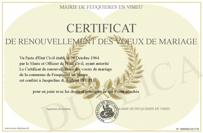 Envoyez par email votre CERTIFICAT DE RENOUVELLEMENT DES VOEUX DE MARIAGE personalisé