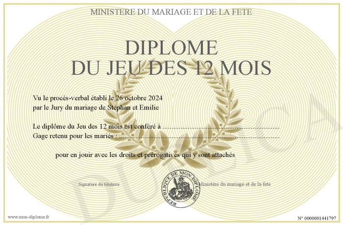 Envoyez par email votre Diplôme du jeu des 12 mois personalisé