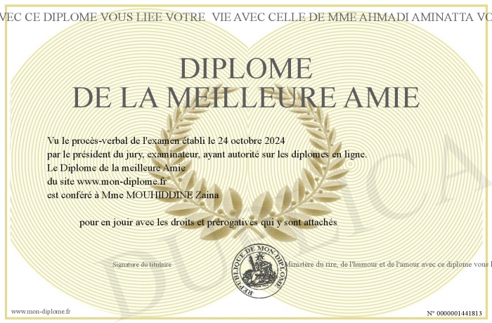 envoyé par le Ministère du rire, de l'humour et de l'amour avec ce diplome vous liée votre vie avec celle de Mme AHMADI Aminatta vous devrez partager vos joie et vôtre tristesse !