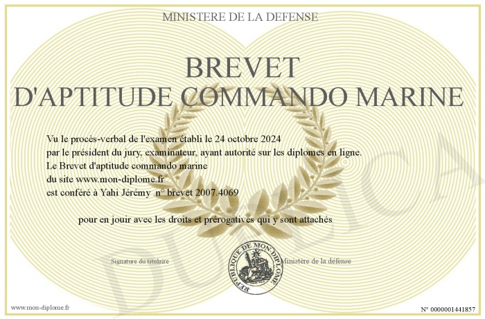 Envoyez par email votre Brevet d'aptitude commando marine personalisé