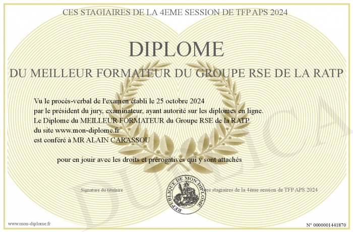 Envoyez par email votre Diplôme du MEILLEUR FORMATEUR du Groupe RSE de la RATP personalisé